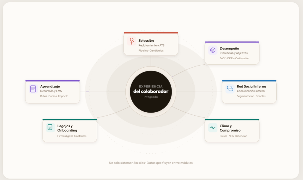 Aquí es donde muchos softwares de RR.HH. muestran sus limitaciones más visibles. Es fácil tener un formulario de evaluación de desempeño o un campo de estado en el proceso de selección. Lo que es difícil, y lo que distingue a las plataformas realmente maduras, es que esos módulos estén integrados entre sí y con el resto del sistema.